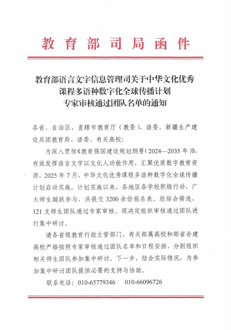 “中华文化优秀课程多语种数字化全球传播计划”是为深入贯彻《教育强国建设规划纲要(2024—2035年)》,进一步发挥语言文字作为国家重要教育资源、科技资源、文化资源、经济资源、安全资源和战略资源的作用,汇聚优质数字教育资源,着力推进数字教育高水平对外开放而实施的重要项目。本次计划共收到全国各高校和教育机构3200余份报名表,经过严格筛选和专家审核,最终仅有121支师生团队通过审核,通过率不足3.8%,竞争异常激烈。