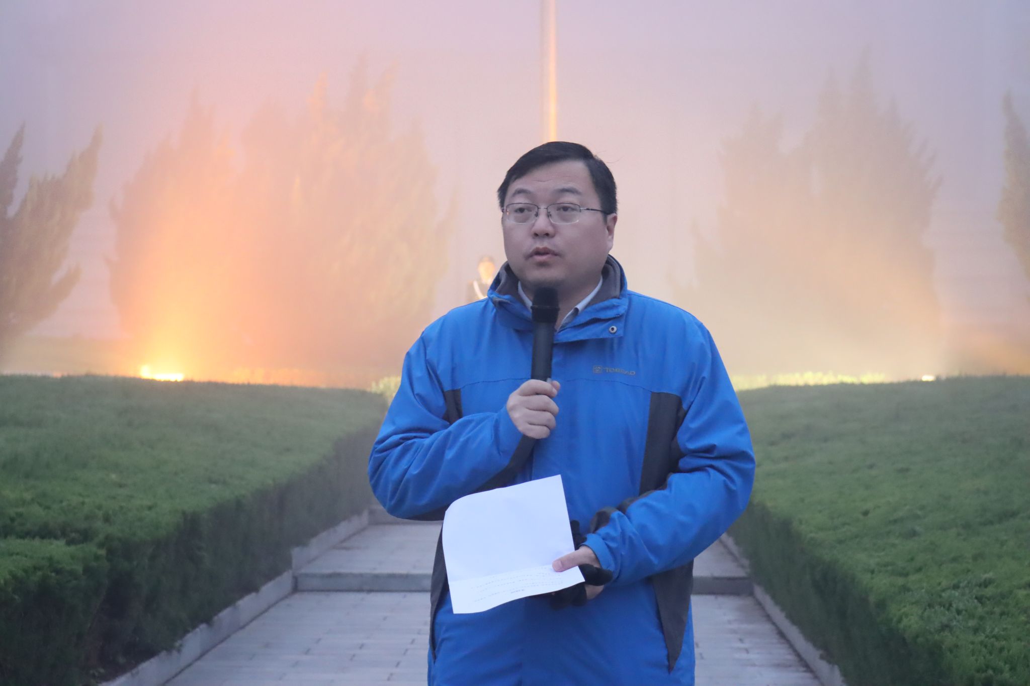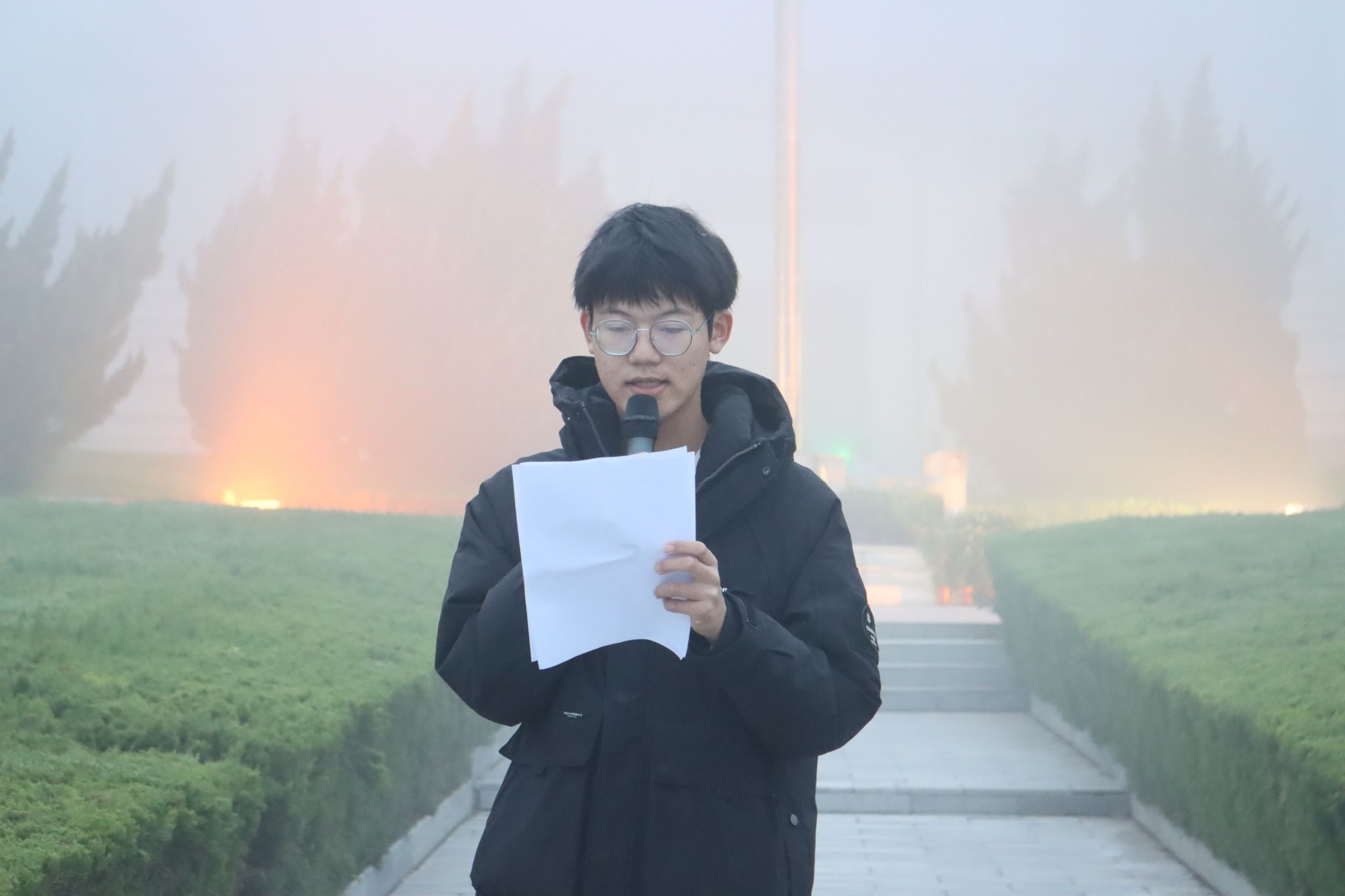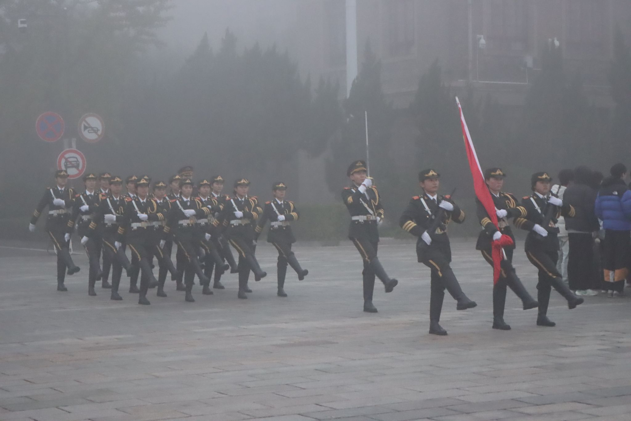 晨曦微露,薄雾轻笼。全体师生在大礼堂广场整齐列队,怀着崇敬之情静待国旗入场。英姿飒爽的国旗护卫队迈着铿锵有力的步伐,精神抖擞地从队列后方正步前行至升旗台前。在雄壮的国歌声中,鲜艳的五星红旗冉冉升起,全体师生肃立行注目礼,现场气氛庄严肃穆。