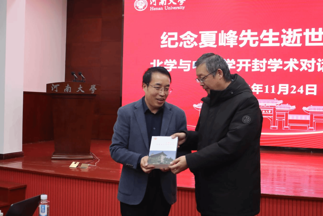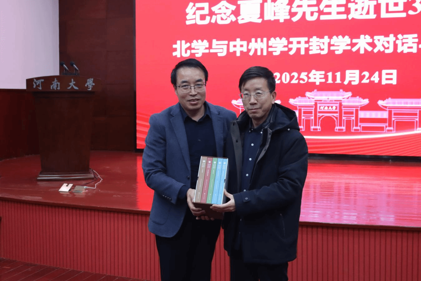 哲学与公共管理学院副院长、河南省宋文化研究院副院长赵炎峰教授担任主持,下半场开始,举行双方赠书仪式,祁琛云教授、赵广军教授通过《河大史学百年文丛》以展现中原史学的百年学术风貌,梁世和研究员、彭永捷教授则以夏峰先生研究的著作承载南北学术的沟通媒介。