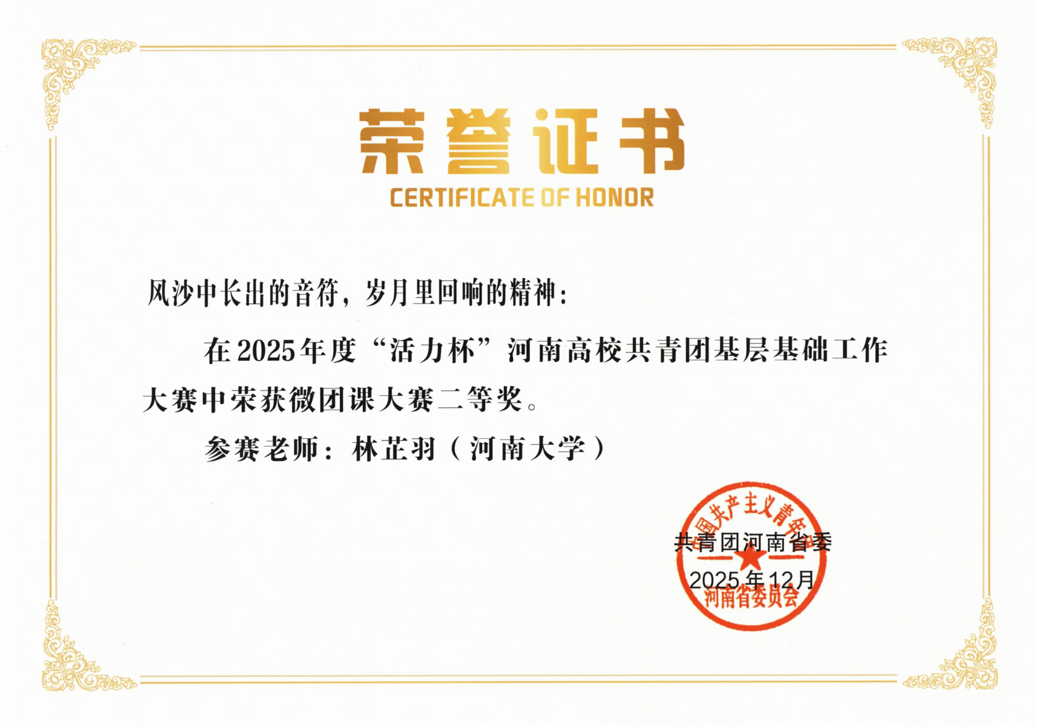 教师林芷羽主讲的微团课作品,经层层选拔推荐,在后续评选中荣获河南省二等奖,充分展现了学院共青团工作的扎实基础与青年师生的良好风貌。