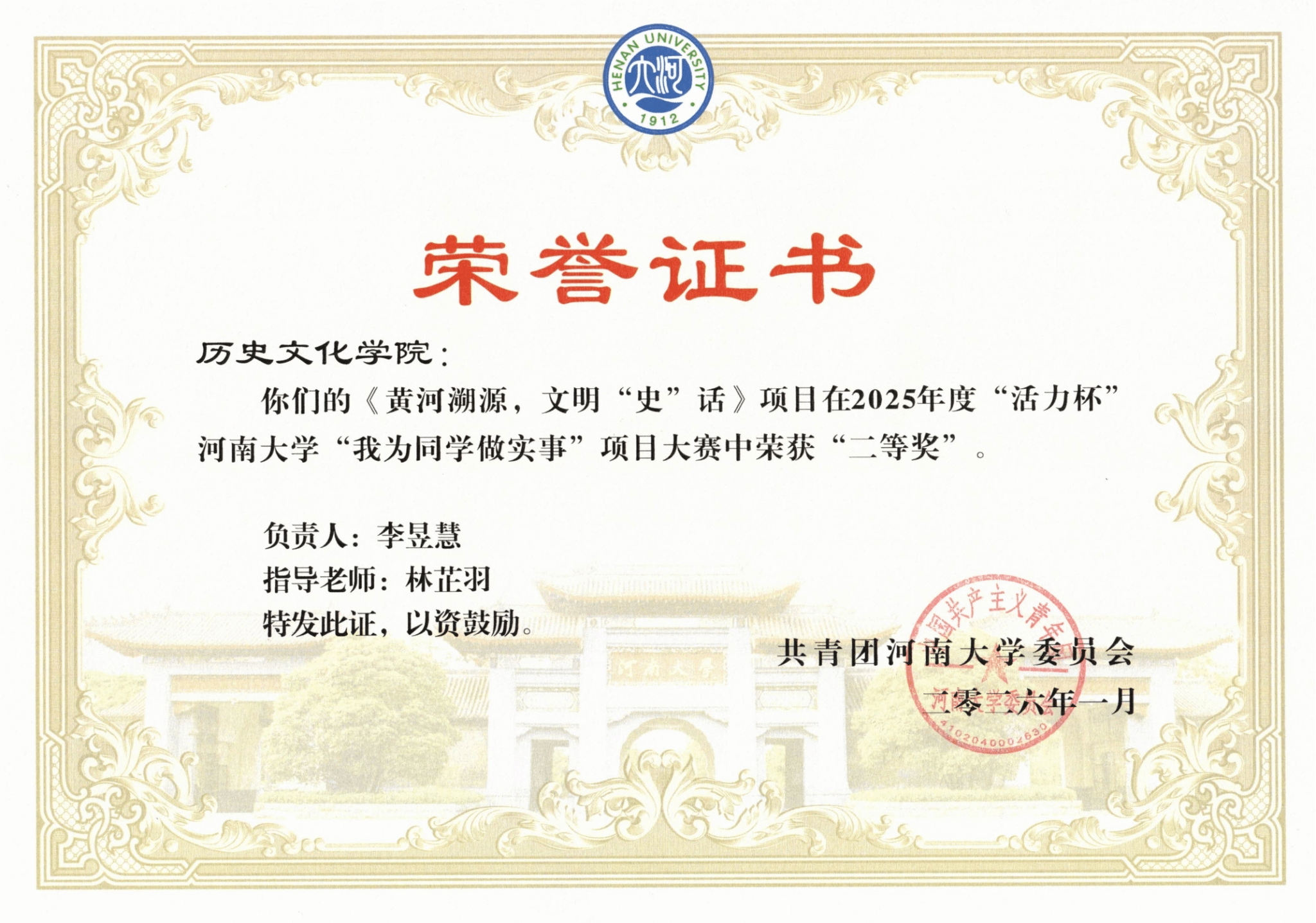 学子李昱慧等人作品《黄河溯源,文明“史”话》项目荣获二等奖。项目立足历史学专业特色,建立了以赛促研、以行明理,以讲致学的完善运行机制,切实服务同学们学业成长与文化素养提升,生动践行了“以学生为中心”的服务理念。